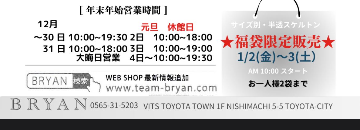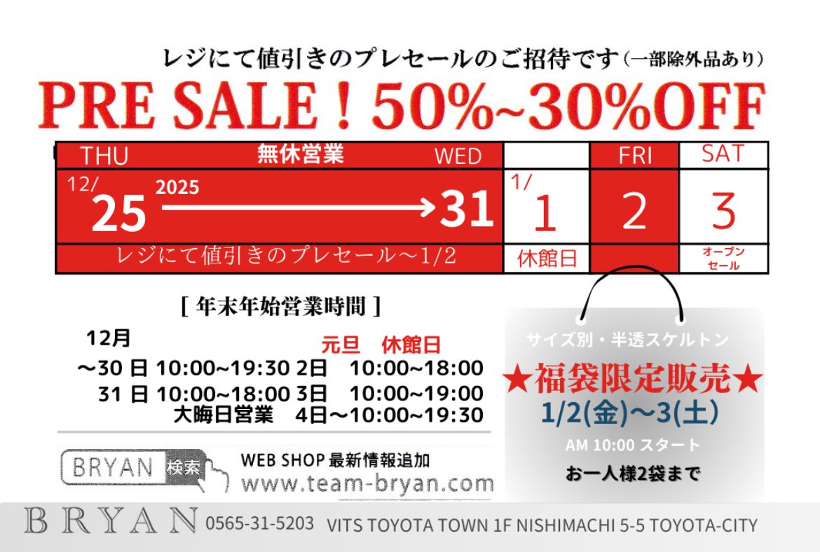 BRYAN店頭では12/25よりPRE SALEを開始!(除外品あり)