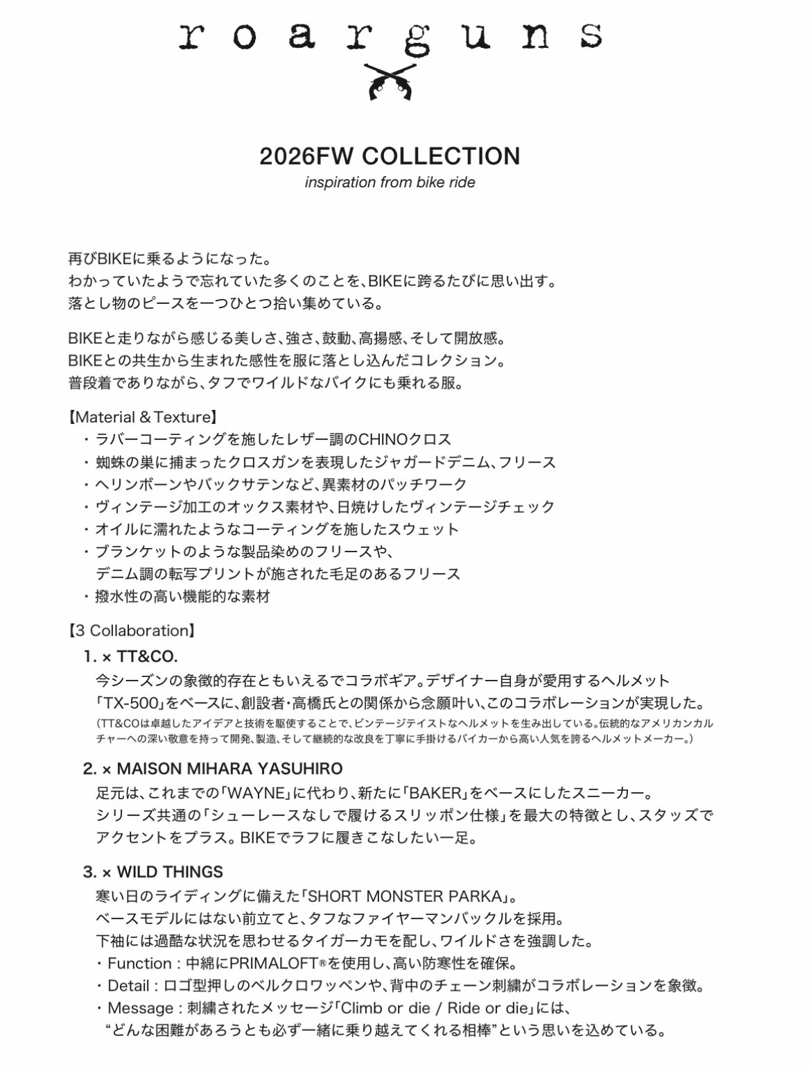 2026-27FALL&WINTER roarguns新作 予約ページは、期間限定にてアップ予定 メルマガにて配信 BRYAN インスタでも告知予定