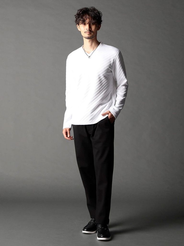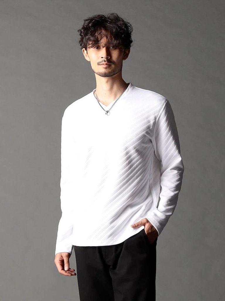 ブリスター(膨れ)編みにより凹凸感のあるバイヤス柄を表現し、シャープな印象とウォーム感を持たせたシンプルな浅VネックロンT。