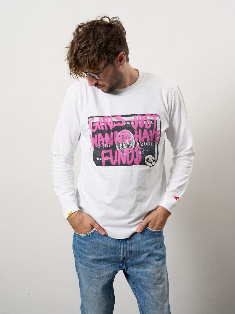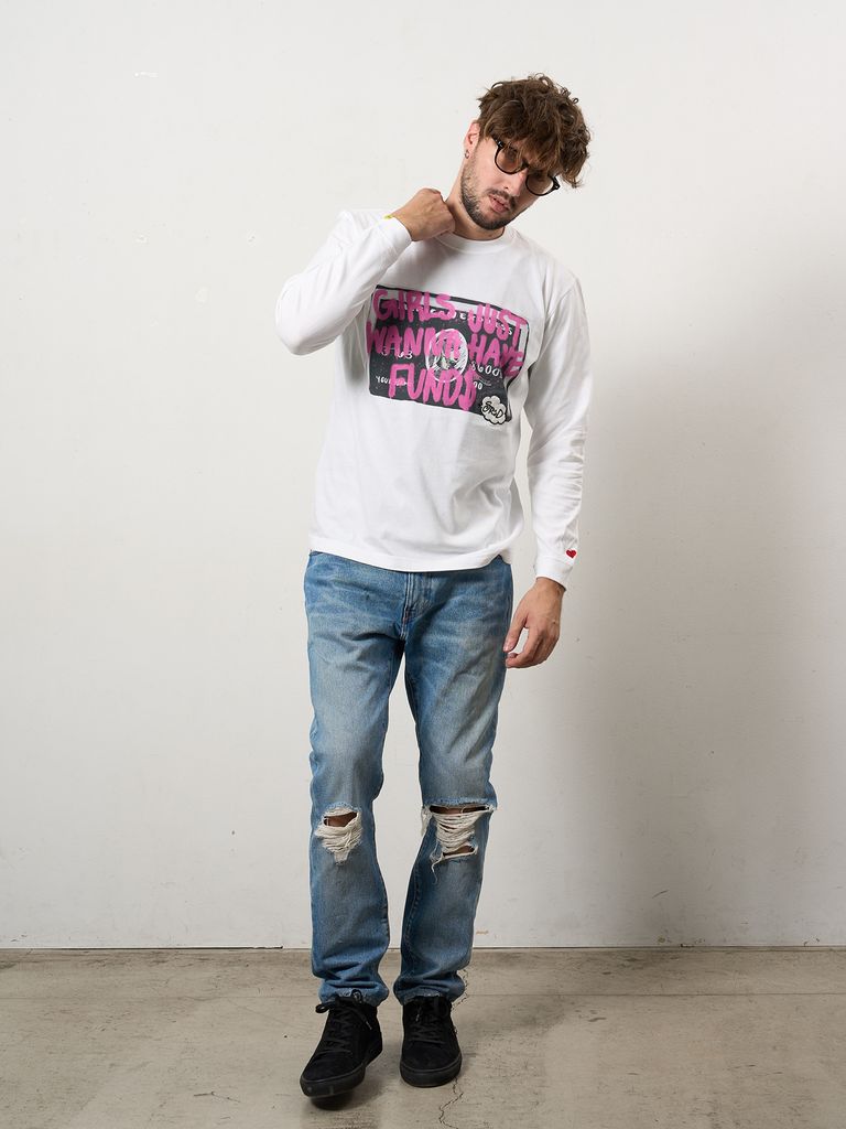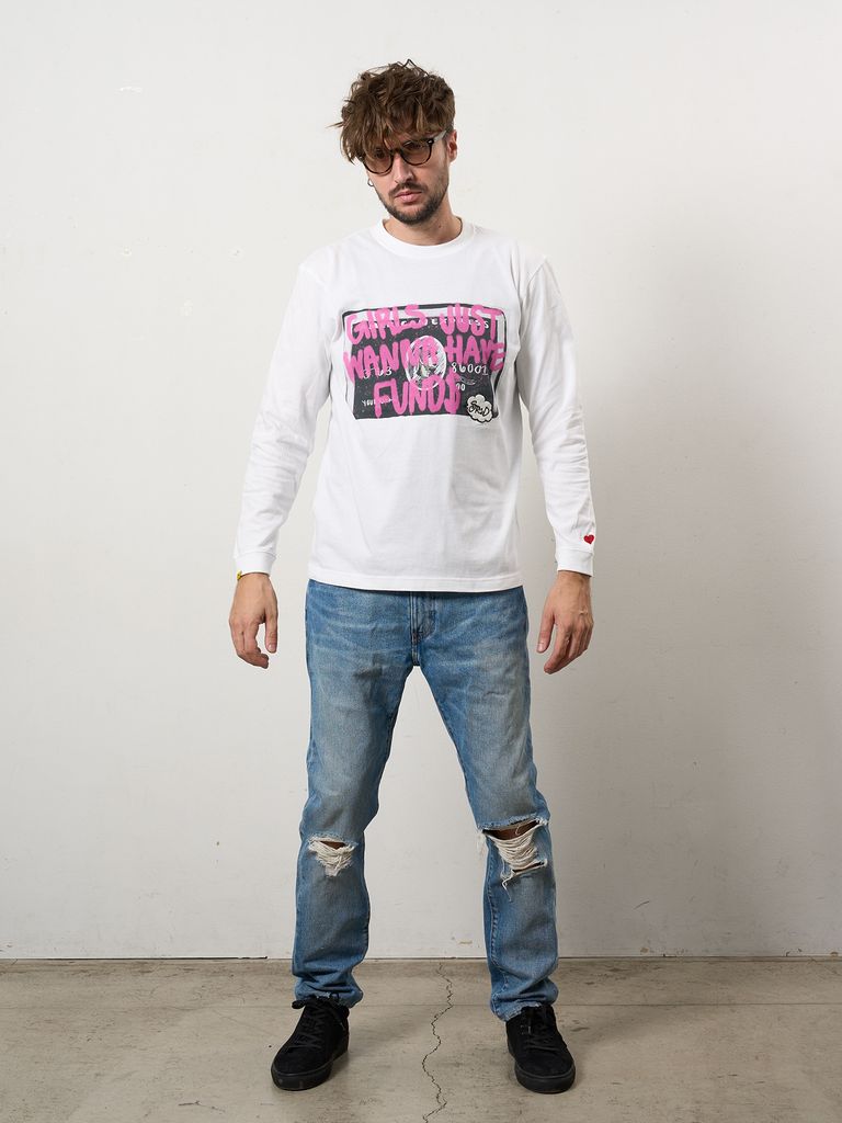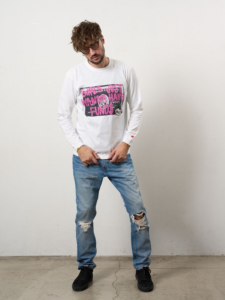 【予約品 10月16日(木) 締切】5.6ozコットン天竺 クレジットグラフィティ&パッチ LSシャツ / ホワイト