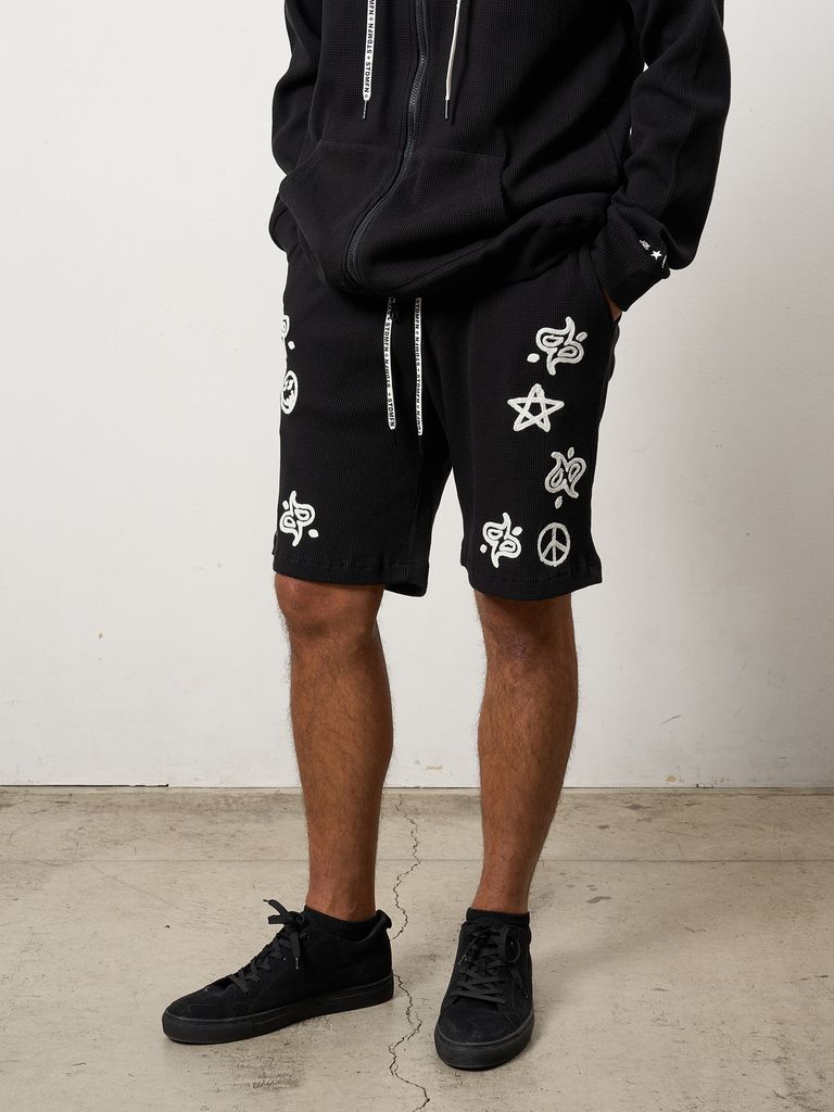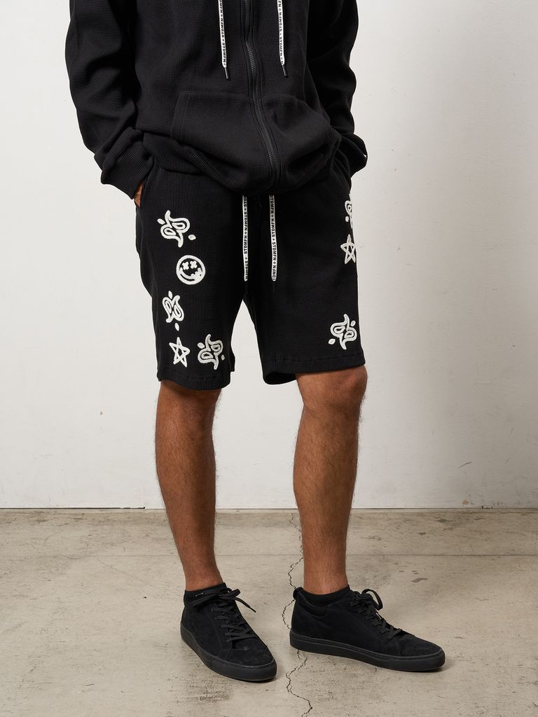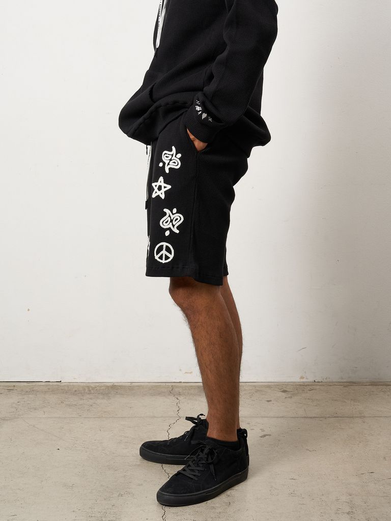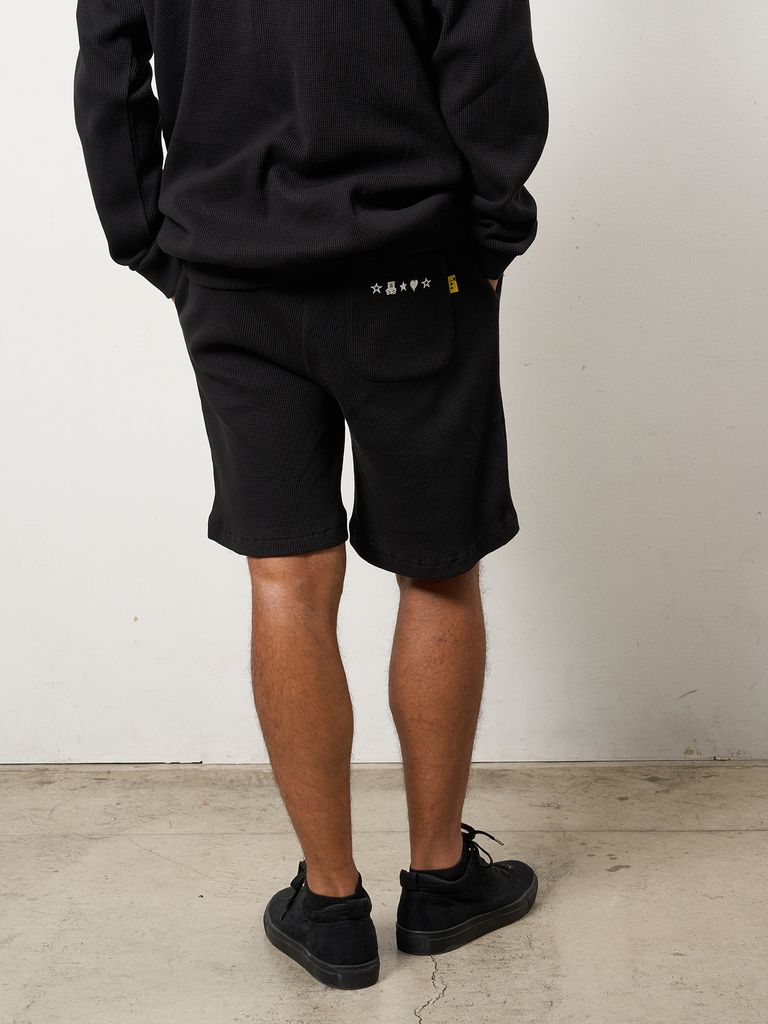 【予約品 10月16日(木) 締切】 ヘビーウエイトコットンワッフル ペイズリーサガラ ショートパンツ / ブラック