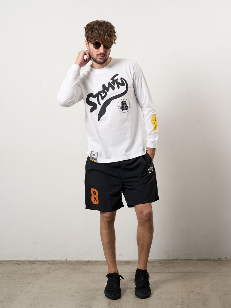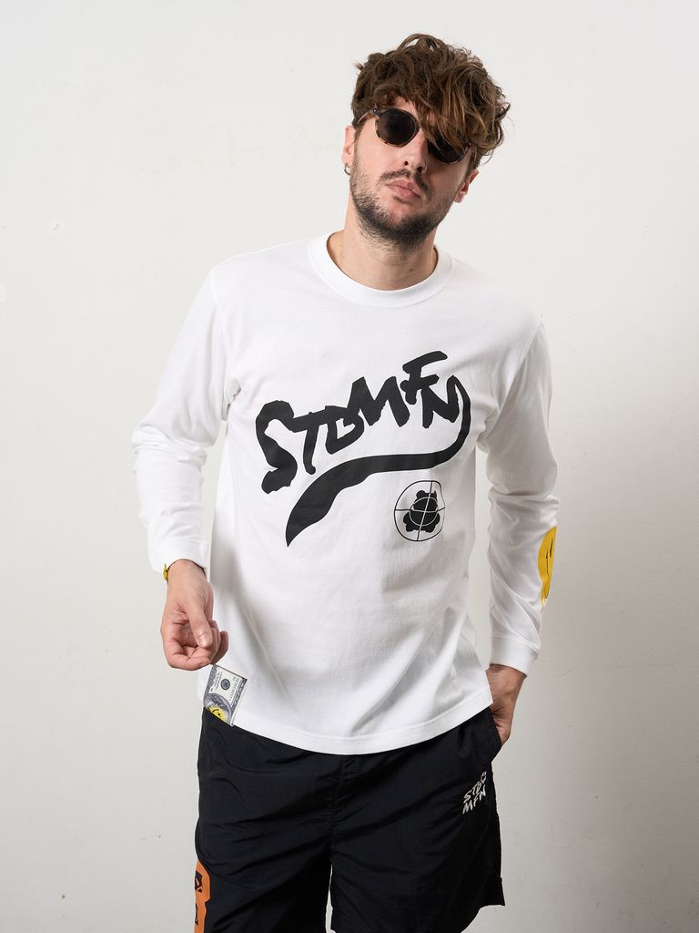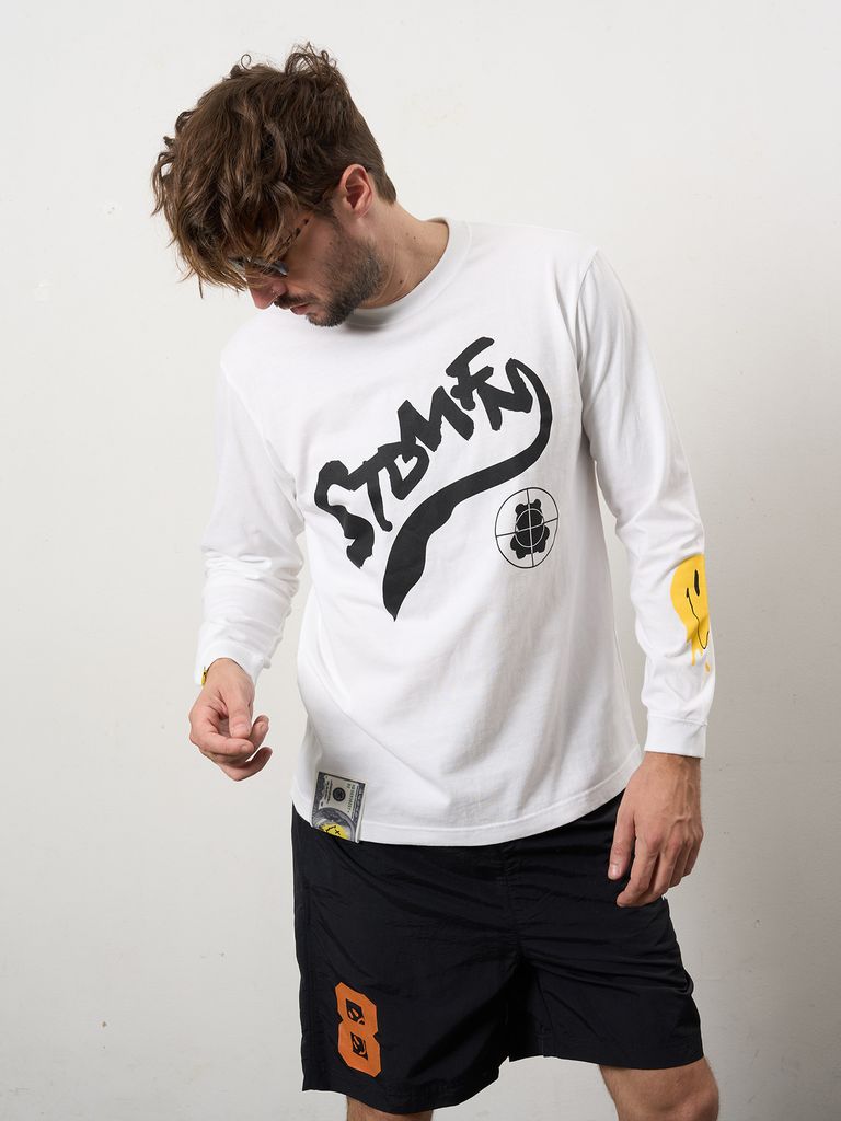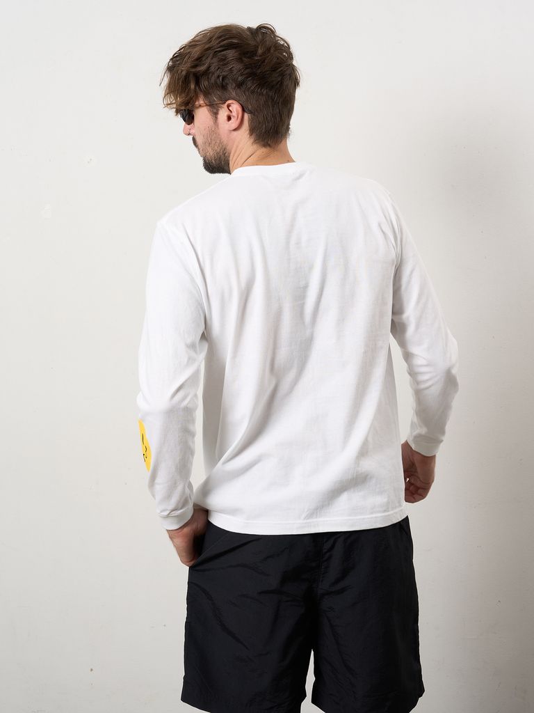 【予約品 10月16日(木) 締切】5.6ozコットン天竺 ウェービーロゴ&ドリップスマイル LSシャツ / ホワイト