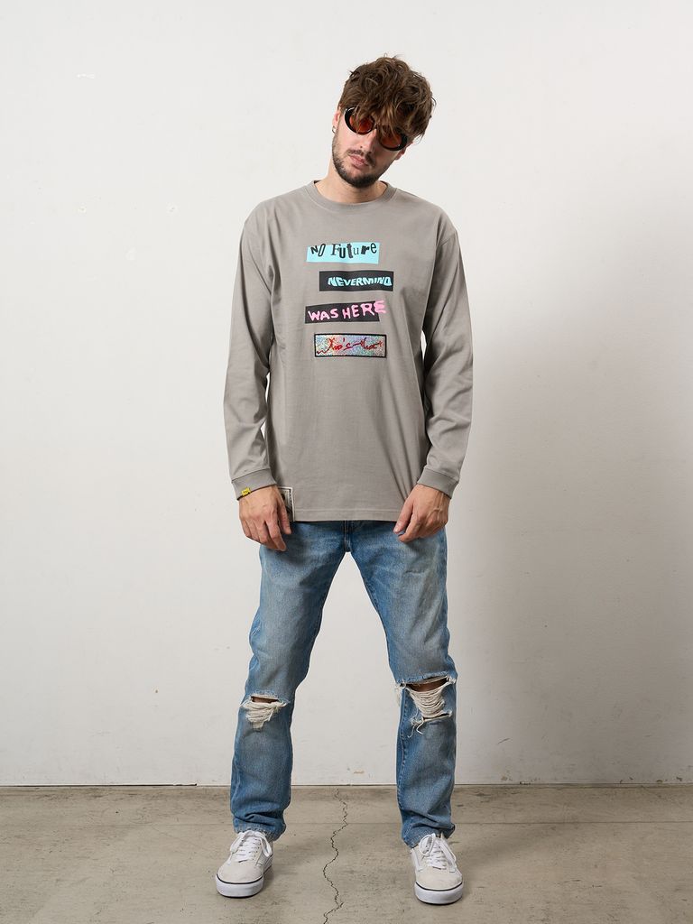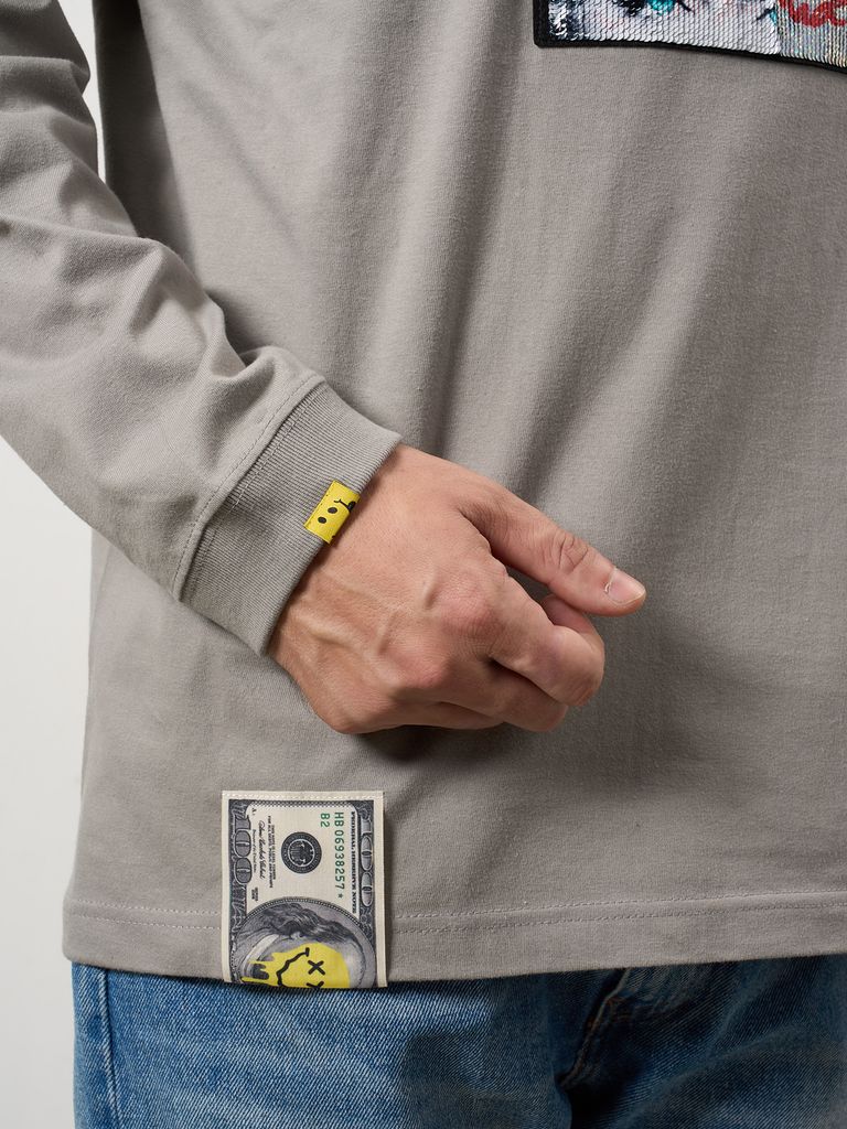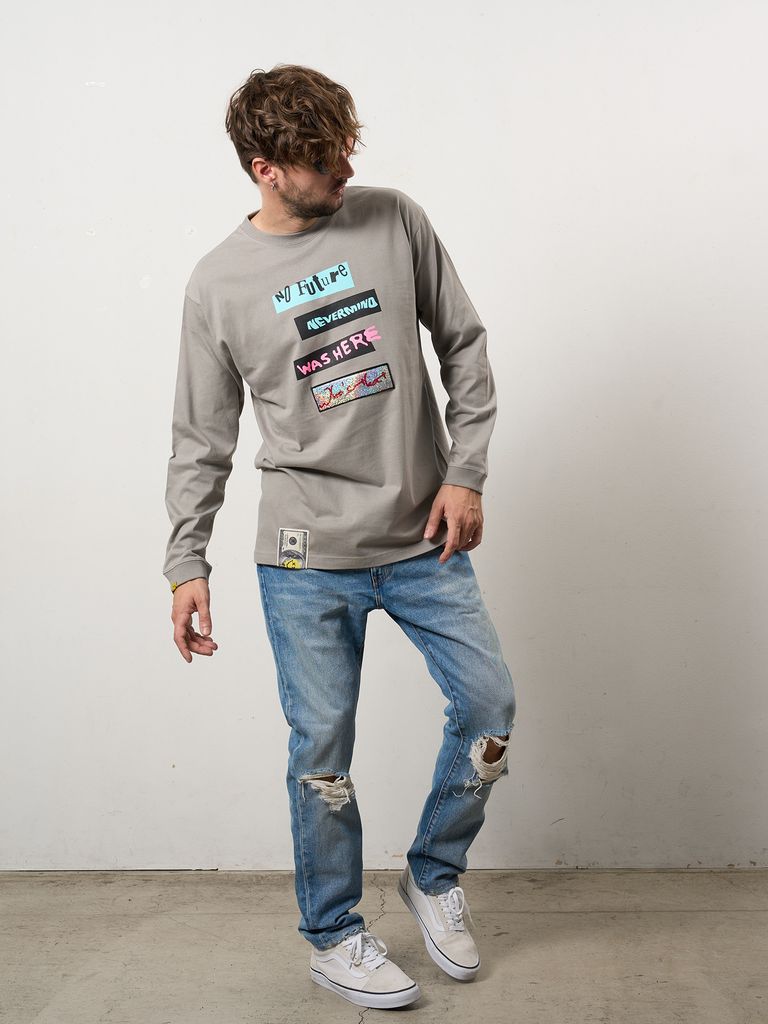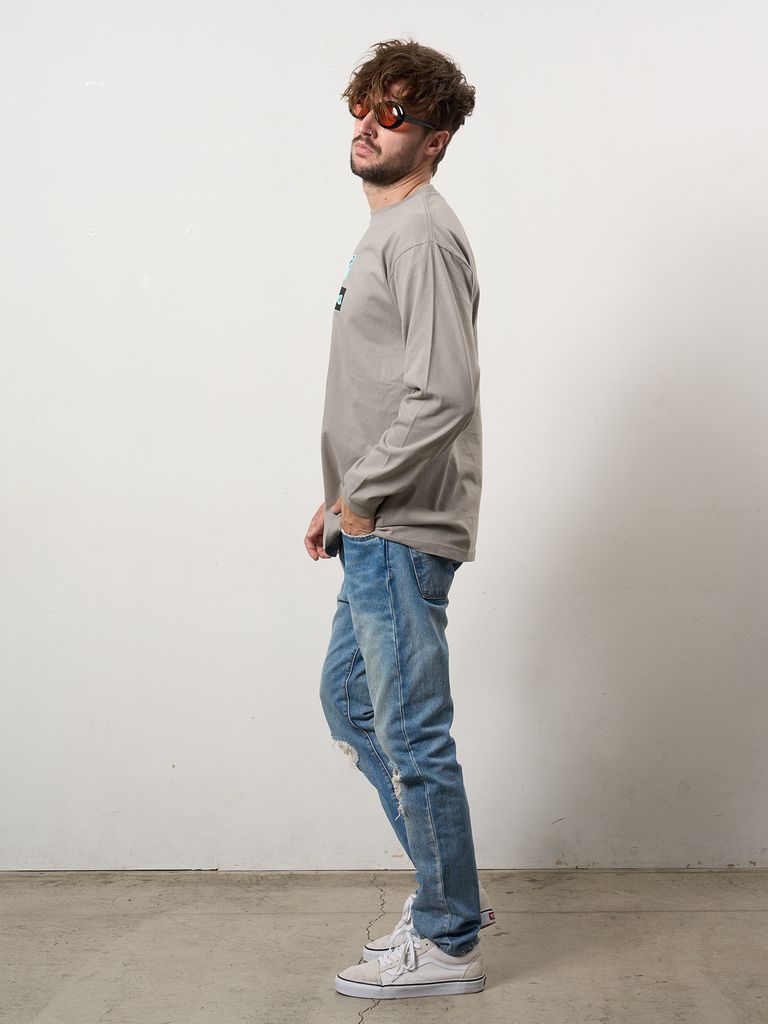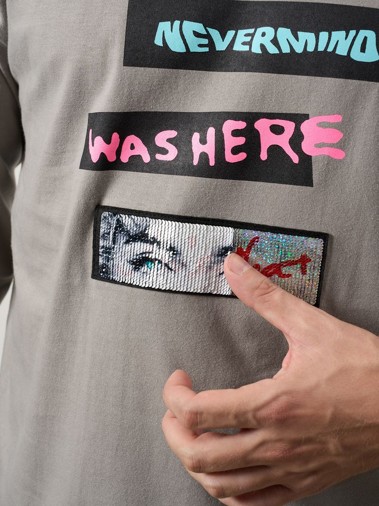 【予約品 10月16日(木) 締切】5.6ozコットン天竺 タイトルボックスシークイン LSシャツ / チャコールグレー