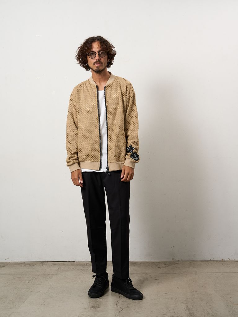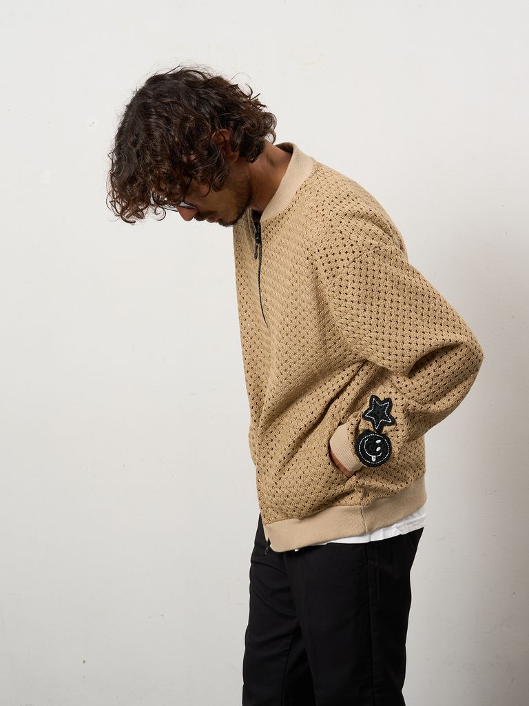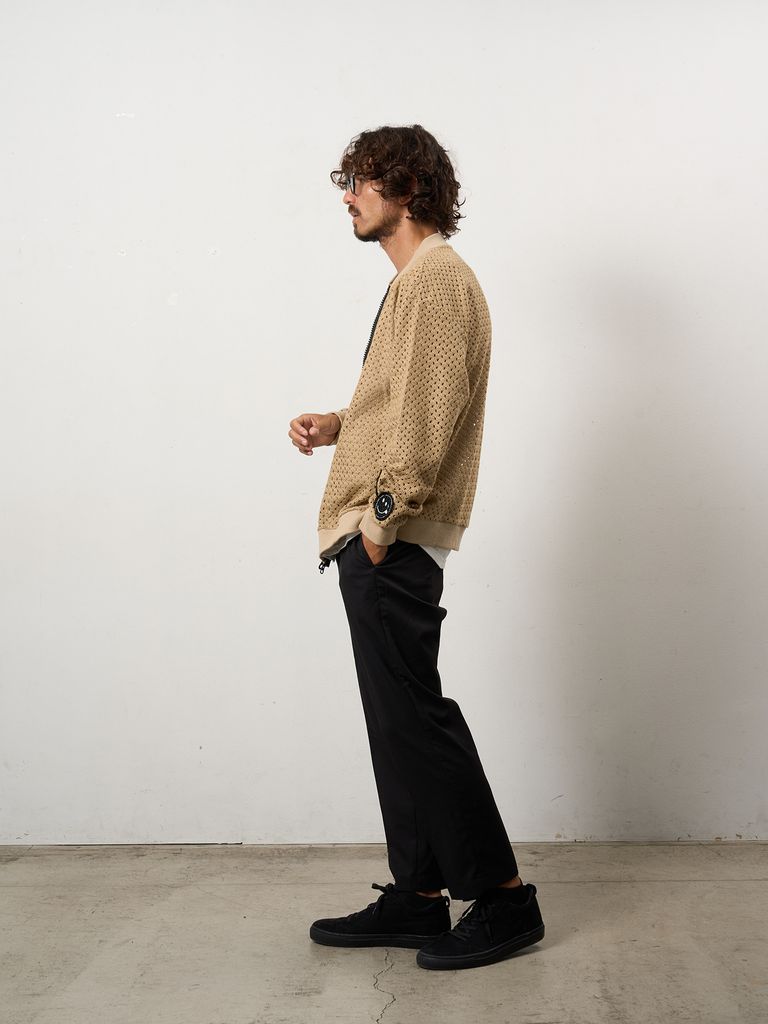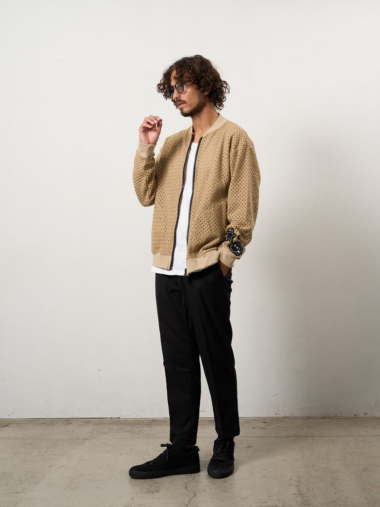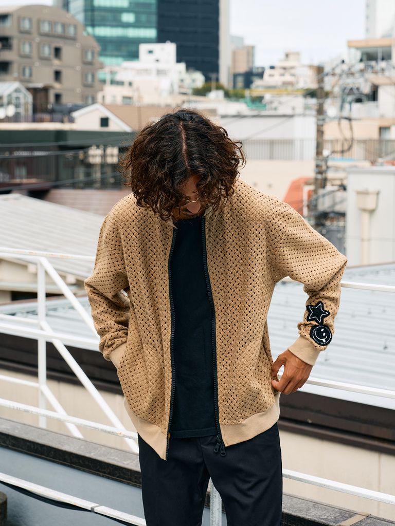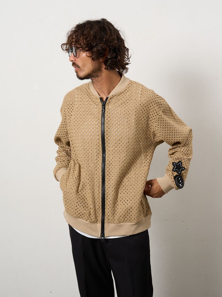 【予約品 10月16日(木) 締切】コットンラッセルメッシュ ハンドニット ワッペン ビッグジップブルゾン / ベージュ