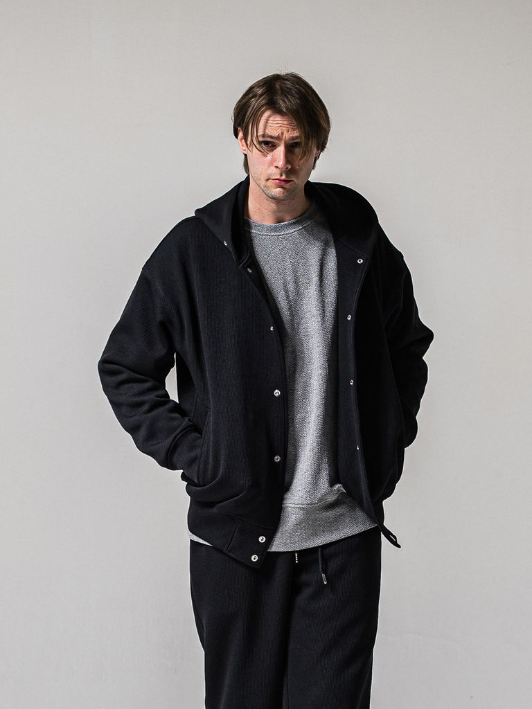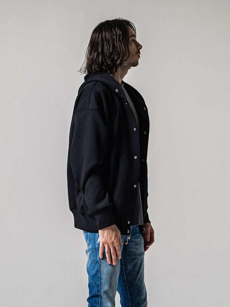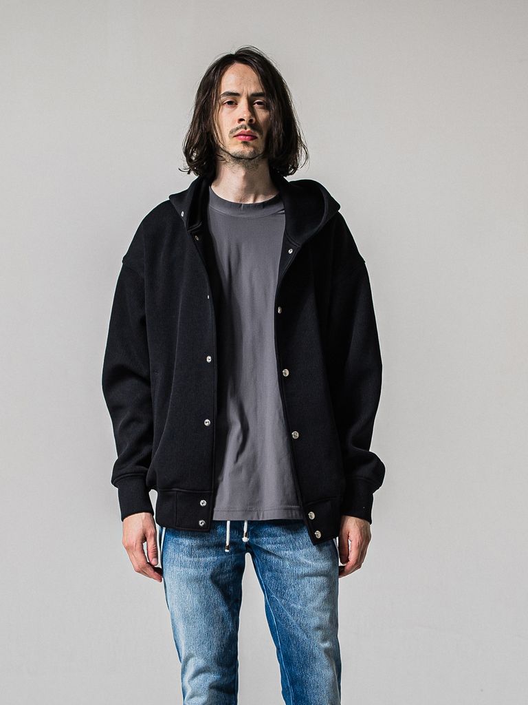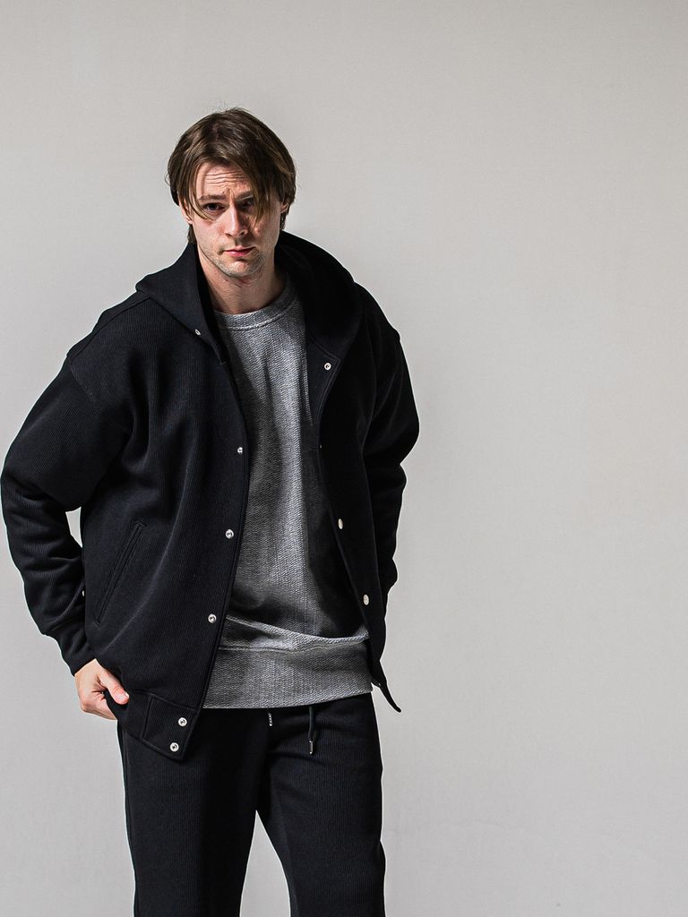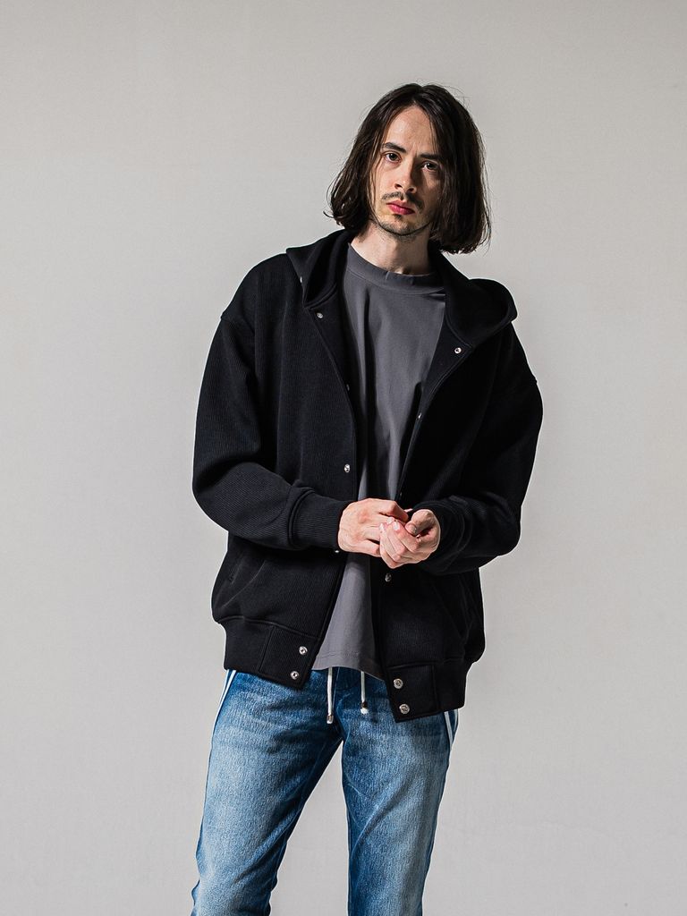 【予約品 11月16日(日) 締切】AZE VARSITY HOODIE / 畔編みニット フード付きスタジャン / ブラック