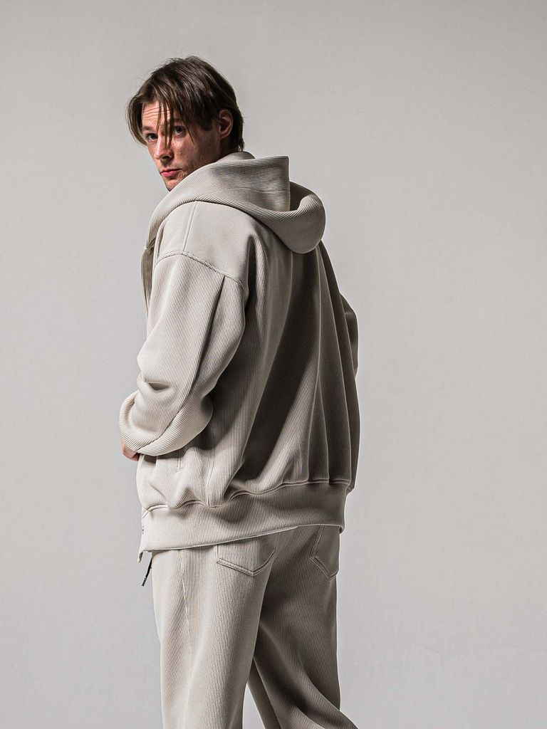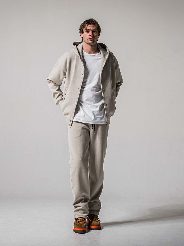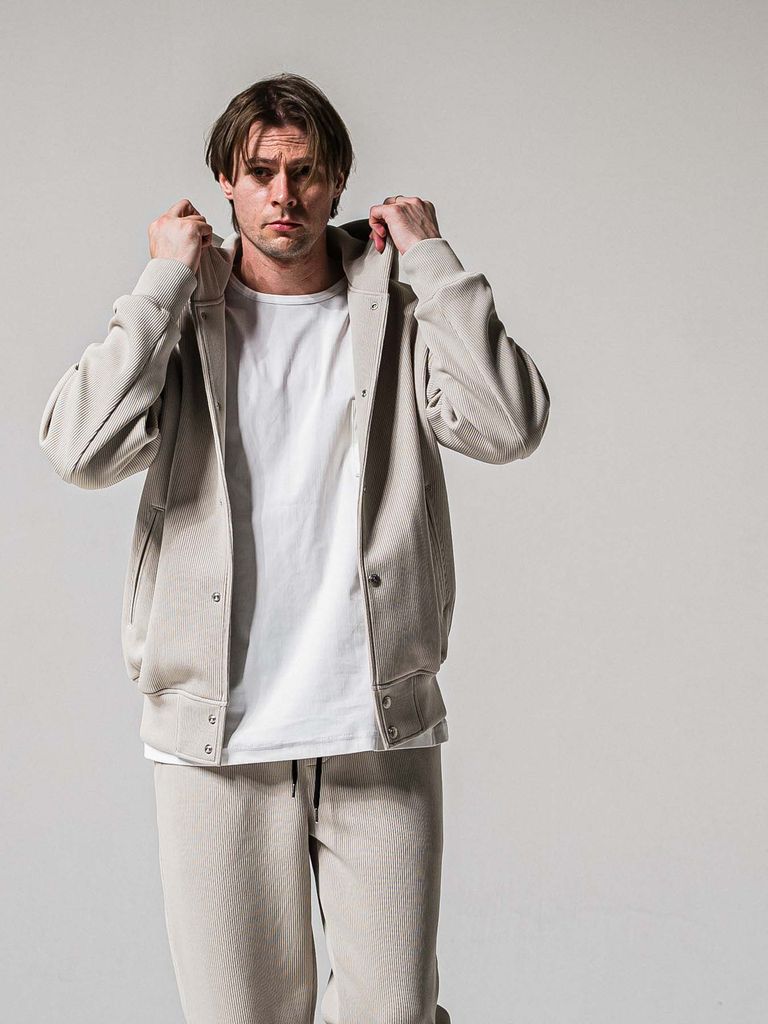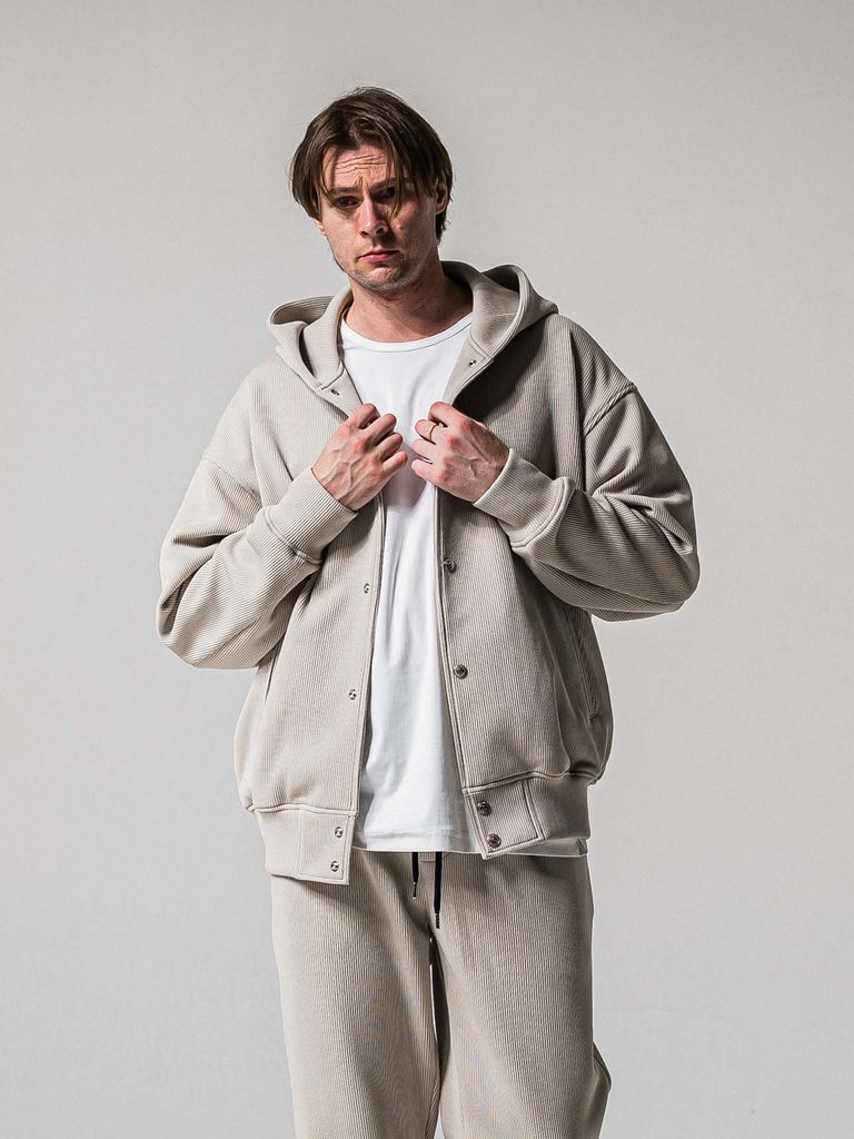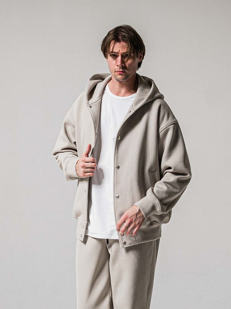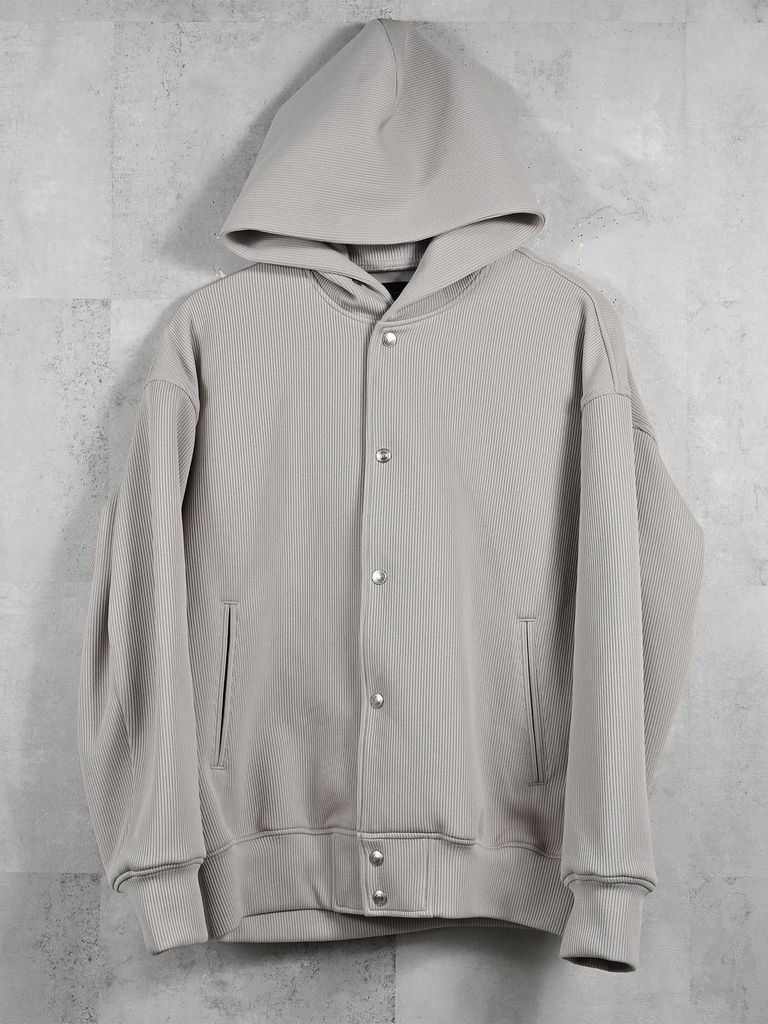 【予約品 11月16日(日) 締切】AZE VARSITY HOODIE / 畔編みニット フード付きスタジャン / グレージュ