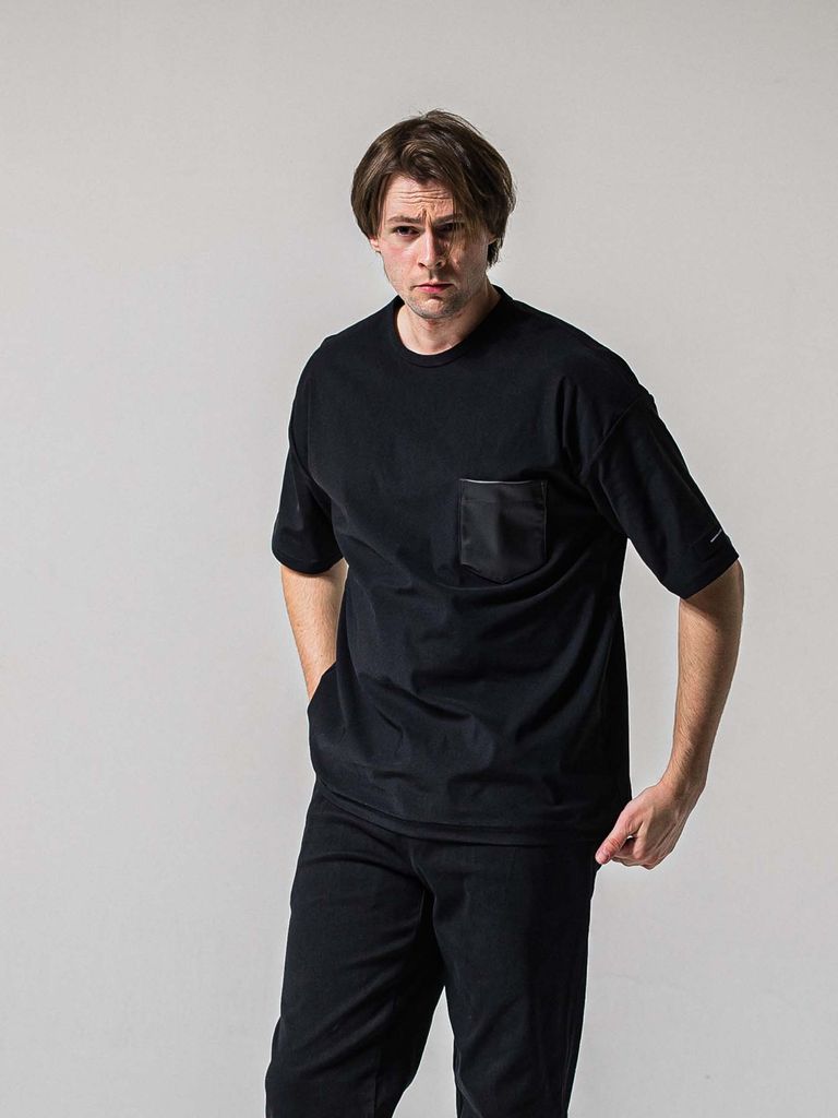 【予約品 11月16日(日) 締切】LEATER POCKET OVER NYLON T / エコレザーポケット ルーズTシャツ / ブラック