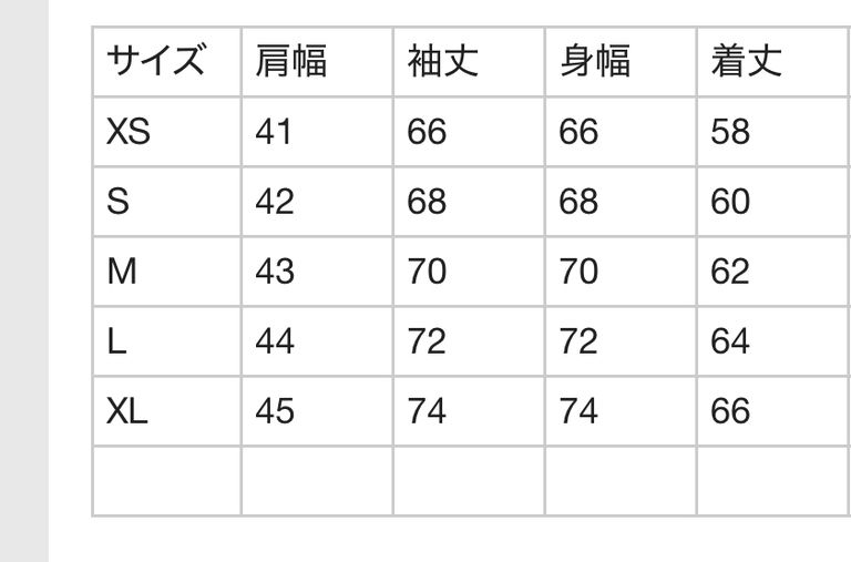| サイズ | 肩幅 | 袖丈 | 身幅 | 着丈 |