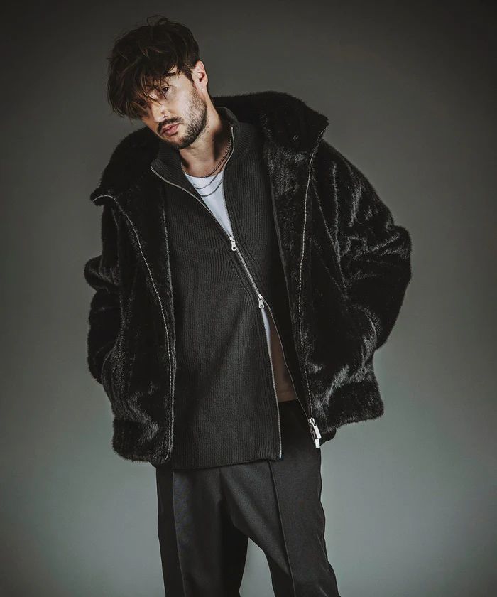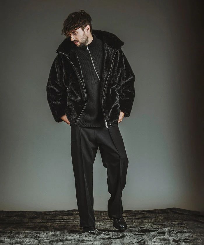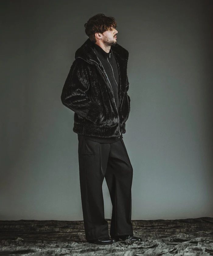 フェイクファーの存在感が強いため、ボトムはシンプルなワイドパンツやスリムパンツでバランスを取ると◎。