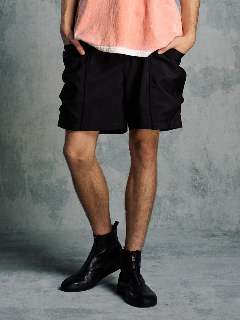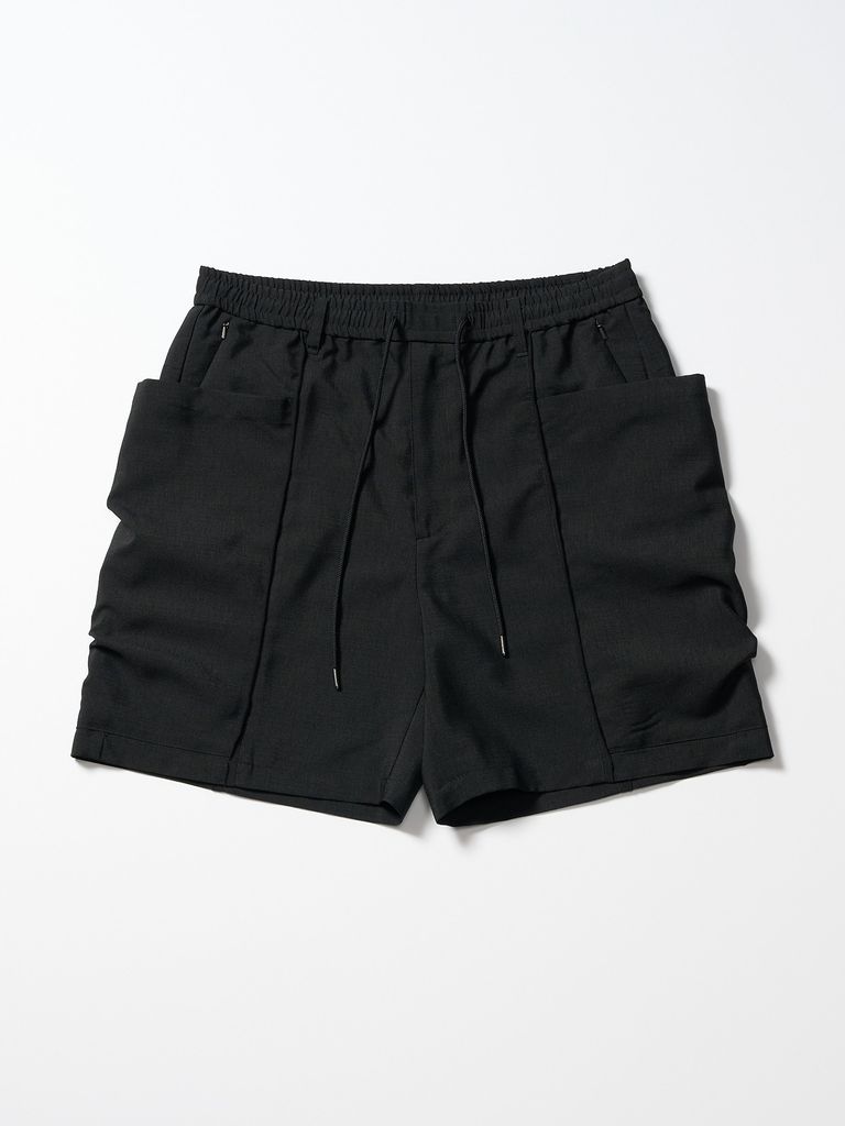 サイドに備えた大ボリュームのポケットが新鮮味を与えるワイドショーツ。昨今トレンドのテックショーツをデザインソースとしつつも、あくまで街着での利用を想定しミニマルにまとめたwjkらしい一着。
