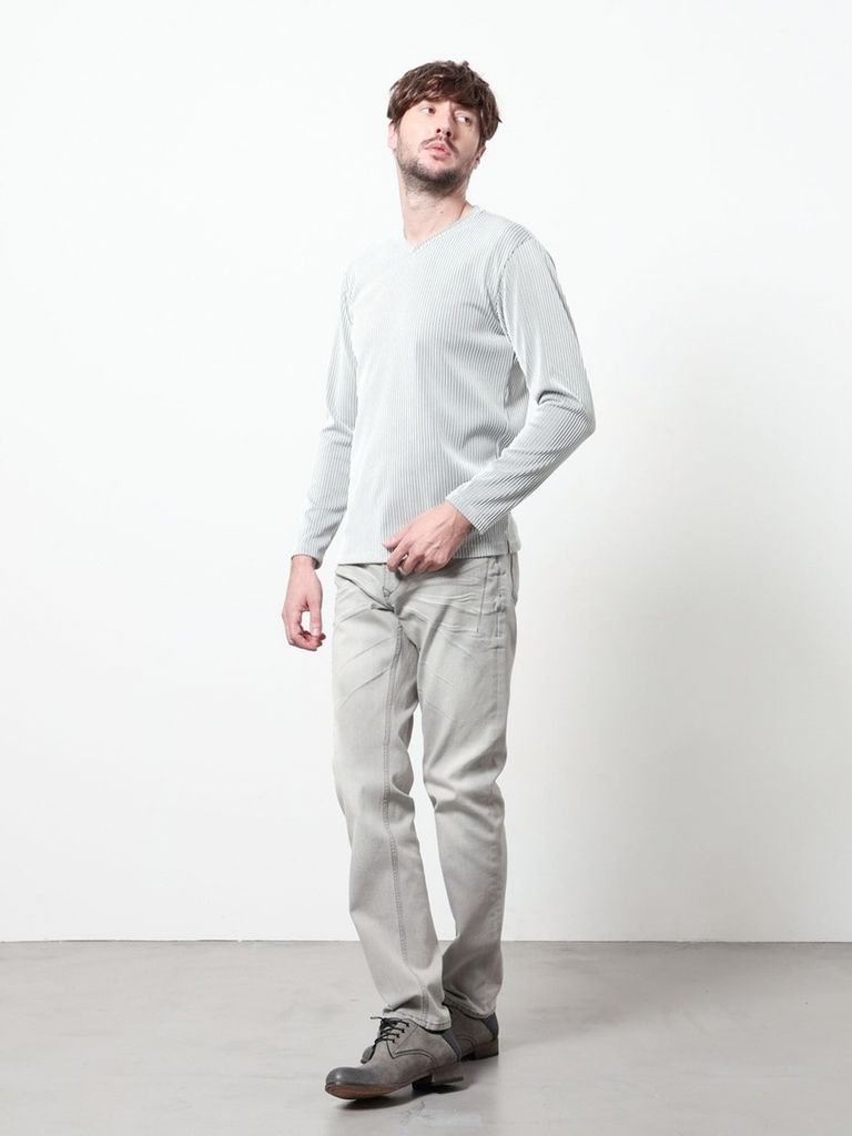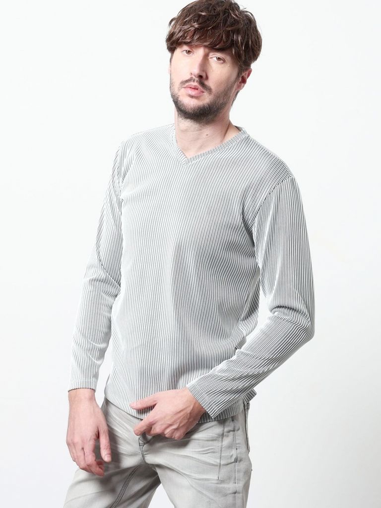 張りのある素材感でインナーとしてもアウターとしても着用できる浅Vネックプルオーバーになります。