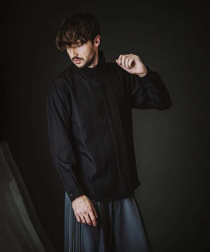 立体的なタックをあしらったスタンドカラーが印象的な、モード感漂うオーバーサイズシャツ。