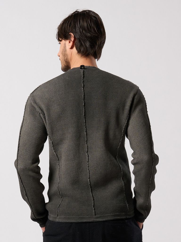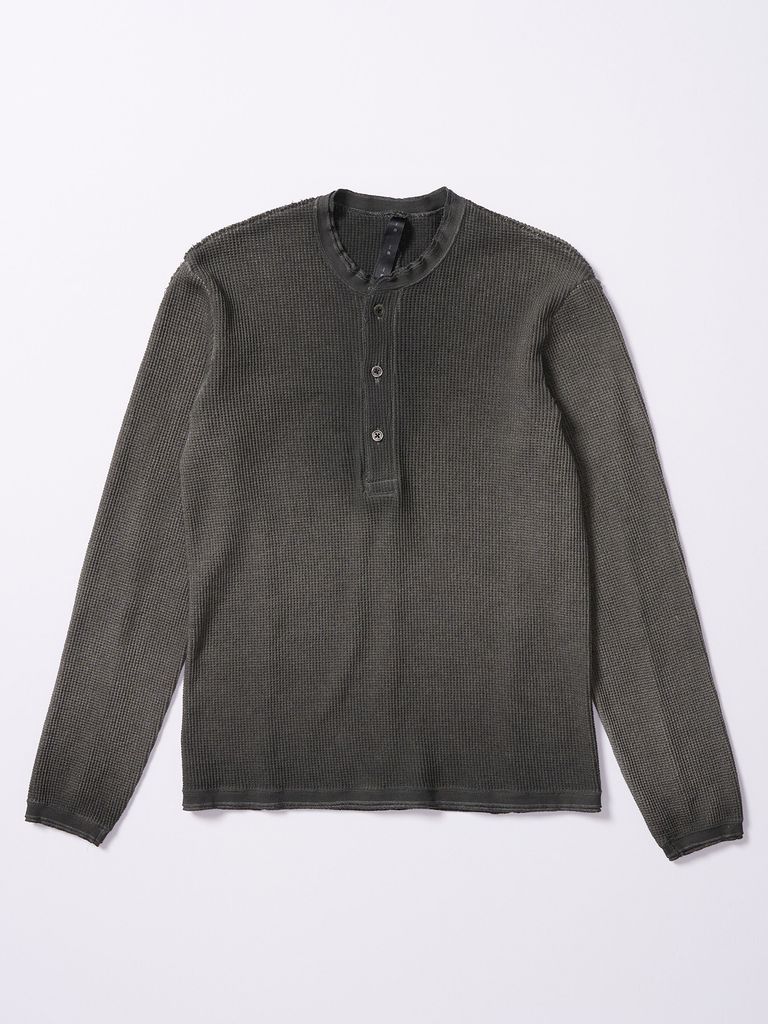 古くからミリタリーやアウトドアのアンダーウェアとして採用されてきたワッフル生地を用いた、ヘンリーネックカットソー。編みによる表面の凹凸が特徴で、夏は肌との接触面を減らし、冬は空気を内包することで保温性を高めるなど、優れた温度調節機能を備えています。