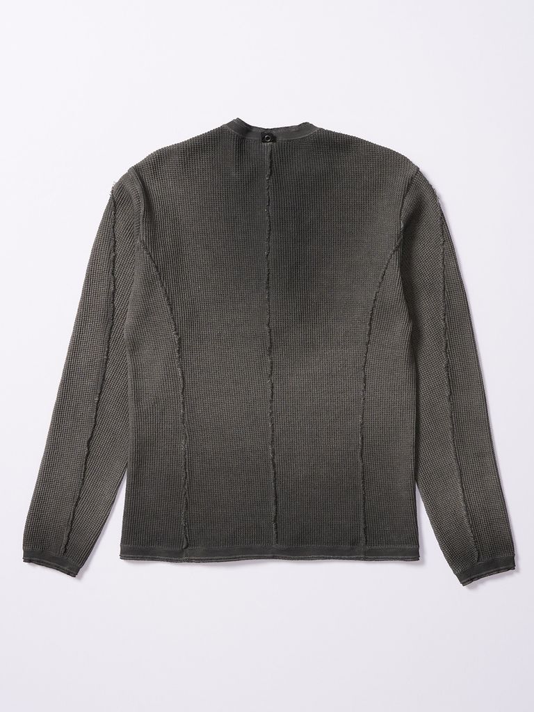 デザインは、随所に断ち切りディテールを取り入れたハードな表情。素材の持つ荒々しさと相まって、無骨な雰囲気を演出します。襟および袖リブは二重のカットオフ仕様とし、wjkらしいエッジの効いたアクセントを加えています。